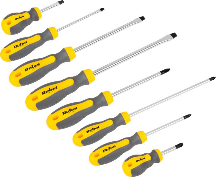 Rebel Tools oferă un set de 8 șurubelnițe care sunt ideale pentru orice atelier. Versatilitatea acestei combinații este subliniată de două tipuri de șurubelnițe: plate și în cruce. Datorită mânerului ergonomic, șurubelnițele Rebel Tools se potrivesc perfect în mână, iar datorită oțelului crom-vanadiu rezistent la coroziune și rugină, vor servi cu adevărat mult timp. Tipuri de șurubelnițe: plate: 0,8x4,0x80 mm, 1,0x5,5x38 mm, 1,2x6,5x125 mm, 1,2x8,0x150 mm; în cruce: PH2x38 mm, PH1x80 mm, PH2x100 mm, PH1x150 mm